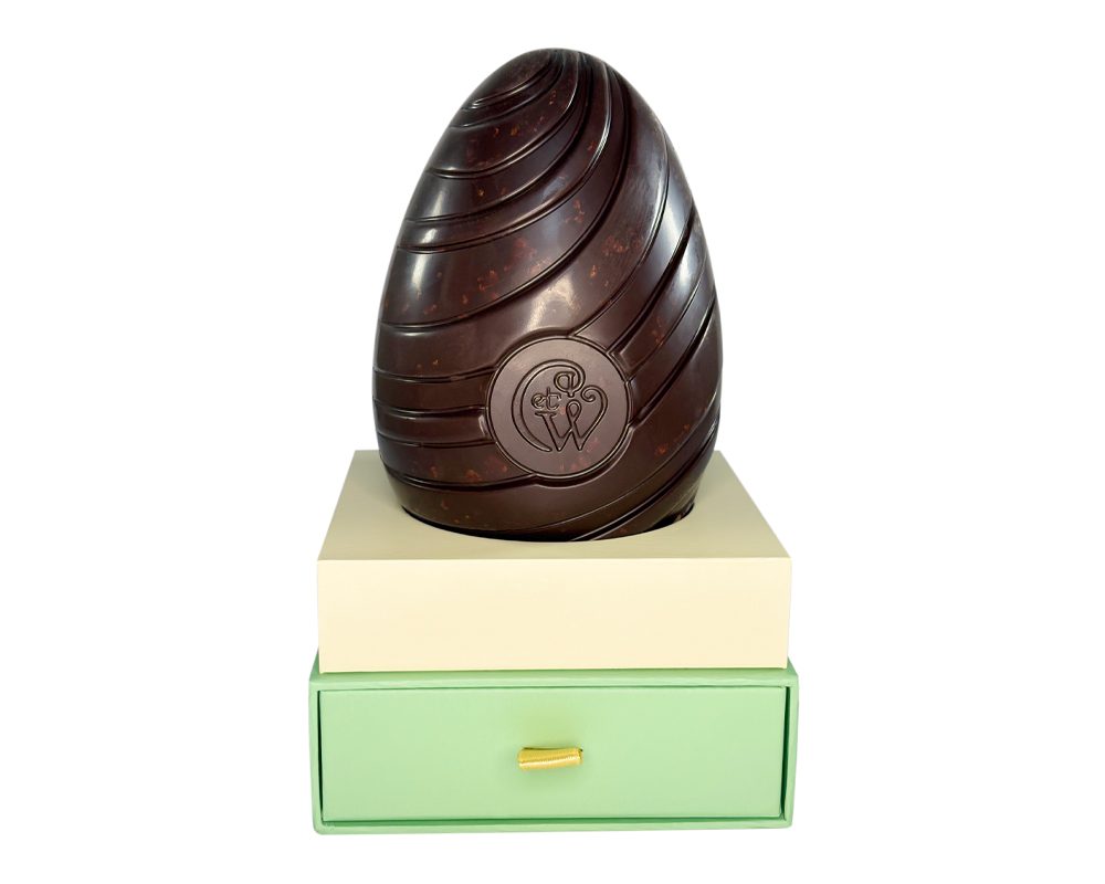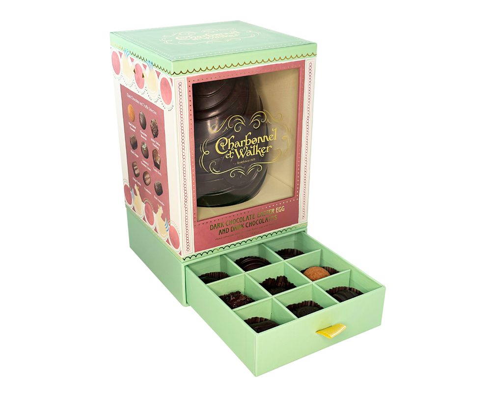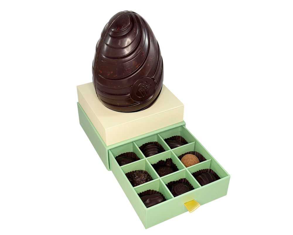 A truly sumptuous Easter Egg! Fine Dark Chocolate is layered with feuilletine pieces throughout the Easter Egg shell for a moreish and textured experience. A drawer opens below with a selection of 9 delicious dark chocolates and truffles to include a Dark Salted Caramel Truffle; Chocolate Brownie Truffle, Dark Sticky Toffee Pudding Truffle, Lemon & Coconut Cream, Dark Logo Cecily, Fudge Vanille, Framboise, Dark Ginger and Amandes. Beautifully presented in an illustrated gift box with scalloped gold edging, Bloomsbury inspired decoration and little yellow hens. A delightful Easter gift.