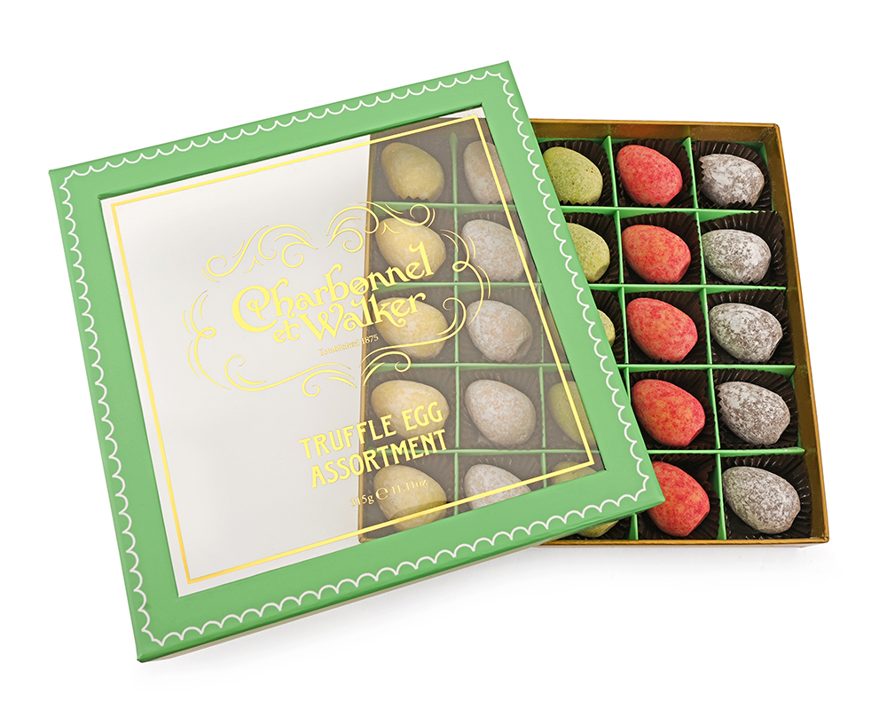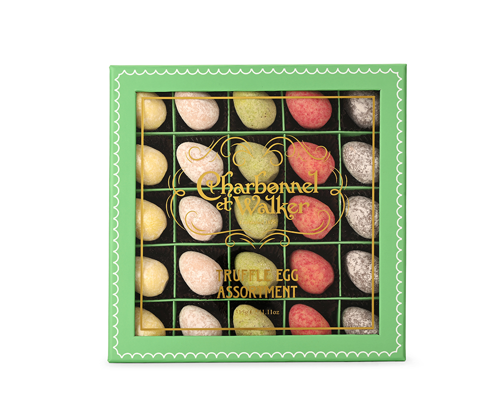 The perfect Easter Selection with Spring flavors. This Easter Egg shaped truffle selection includes Raspberry & Passion-fruit, Milk Sea Salt, Strawberry, Pistachio and  Lemon Truffles.  All housed in a pretty green gift box with scalloped edges and gold detailing. A delightful Easter gift!