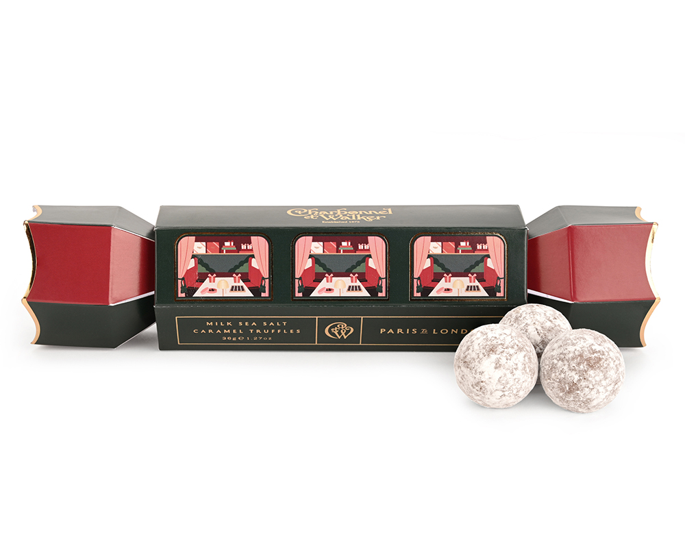 A beautiful Christmas cracker filled with three Milk Chocolate Truffles, each one with a creamy Madagascan Vanilla centre, a generous coating of Milk Chocolate and lightly dusted with a little cocoa powder. A journey of chocolate making history over 150 years, delight in the train carriage illustrations as Madame Charbonnel and Mrs Walker travelled from Paris to London to open their very first store on London’s exclusive Bond Street.