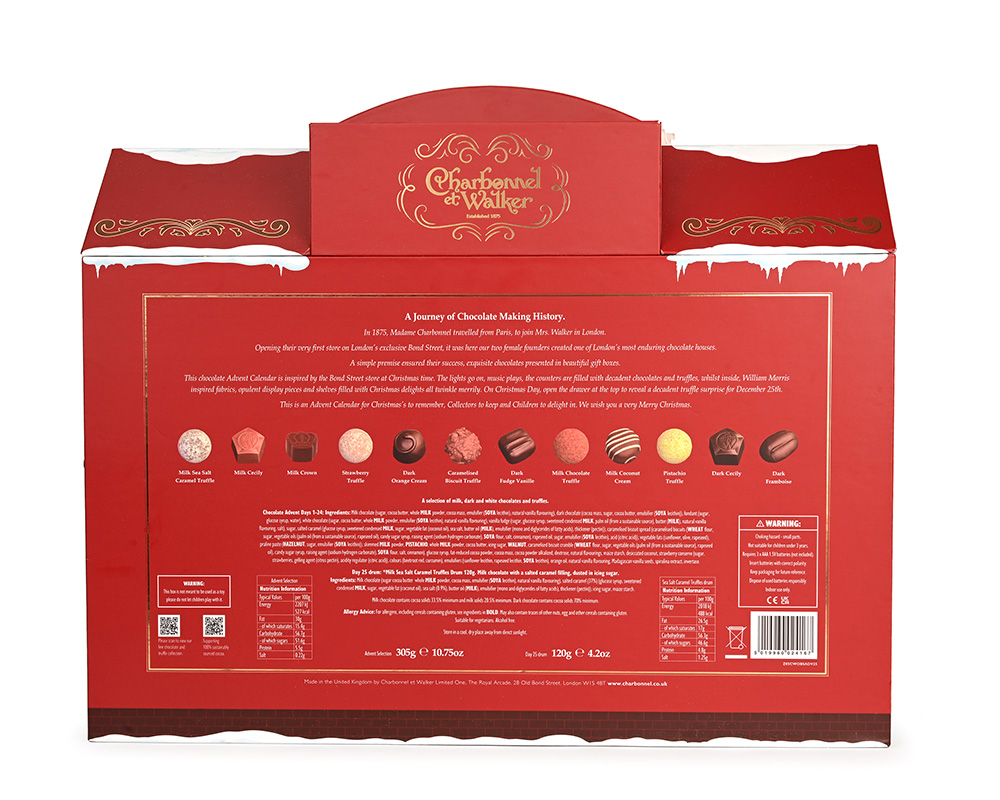 Celebrate 150 years of chocolate making history with Madame Charbonnel and Mrs Walker. Their first store opened on this famous street in 1875.  One of London’s most enduring chocolate houses, this Christmas, join us at the Royal Arcade with an Advent Calendar filled with charm and wonder. Turn on the lights and let the music play as you open the doors to a decadent world of Milk, Dark and White Chocolates and Truffles!