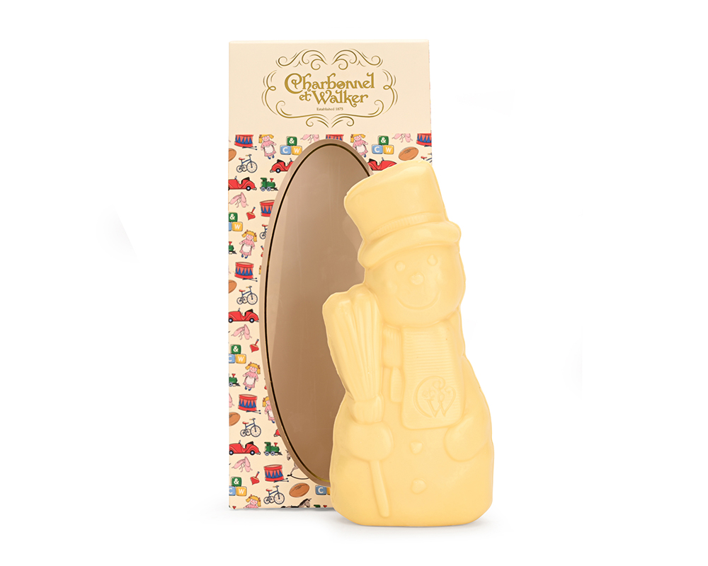 A beautifully crafted chocolate Snowman figurine, made with British white chocolate by Charbonnel et Walker. Presented in a colourful gift bag.